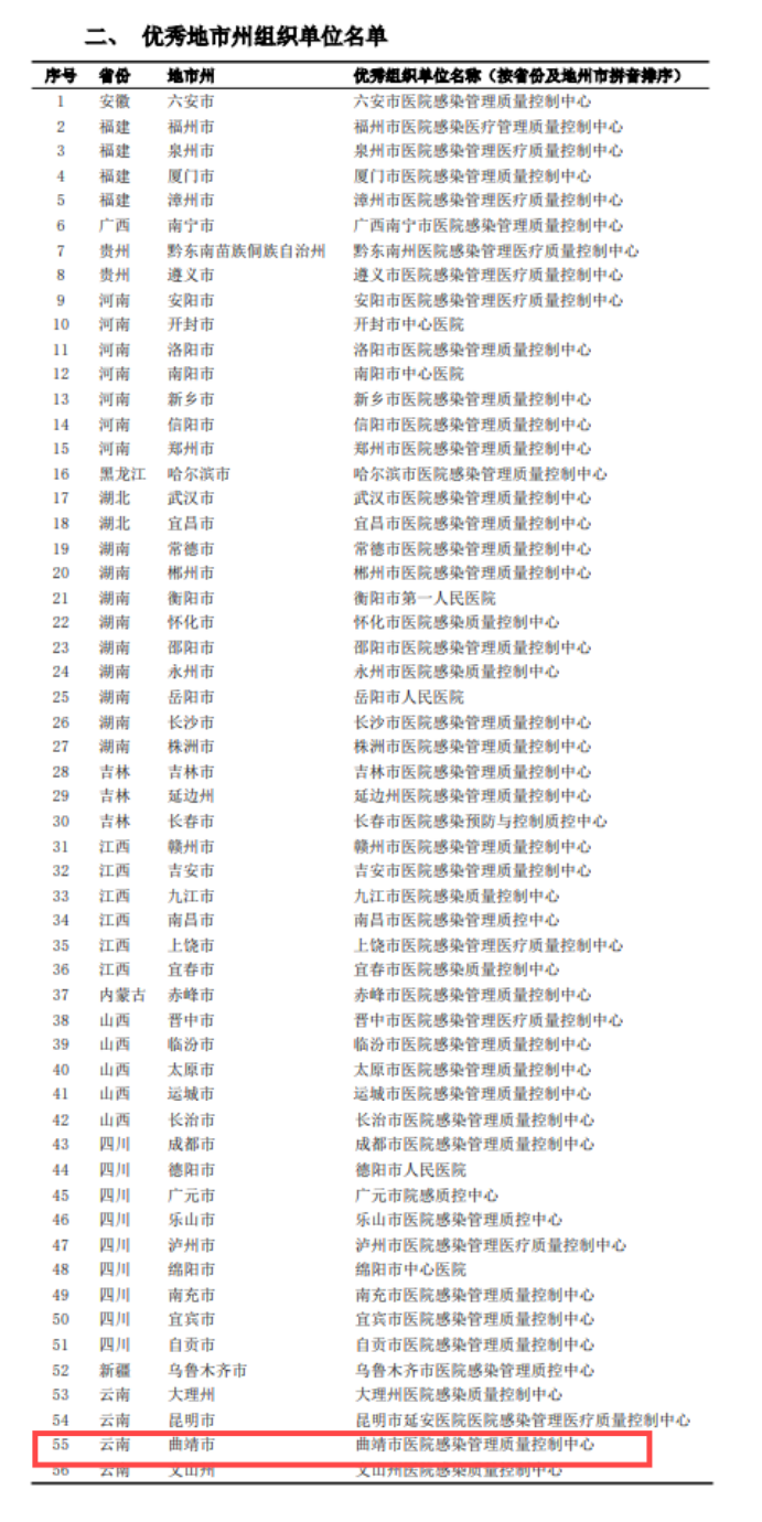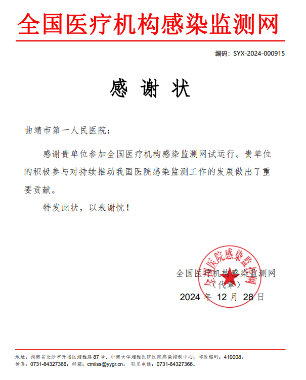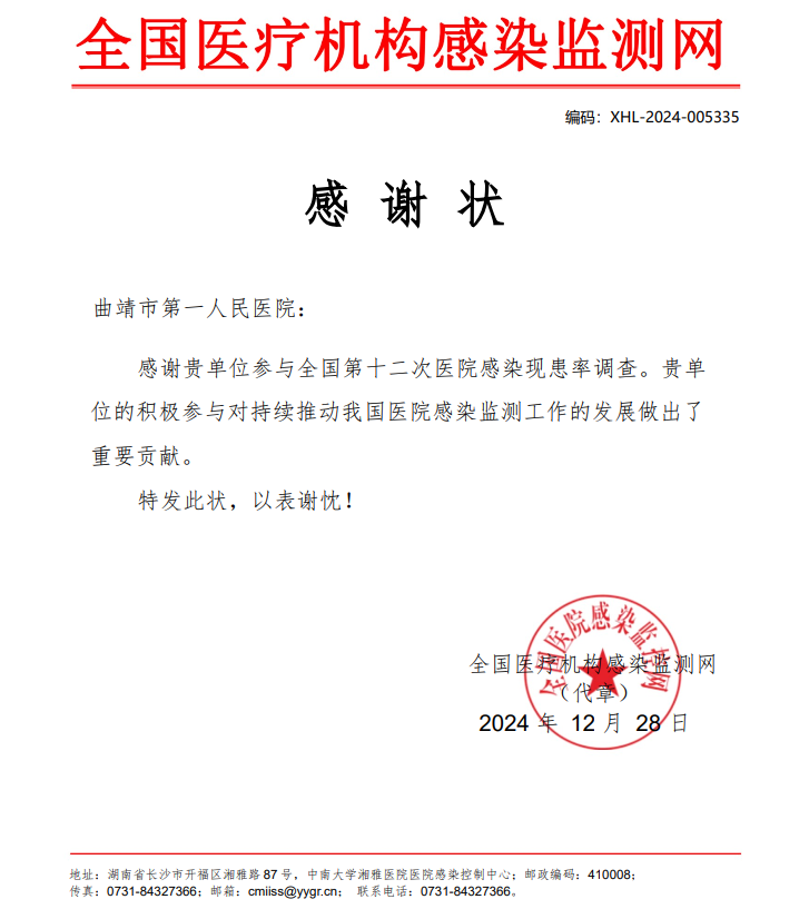 近日,云南省医院感染质量控制中心发布了《关于2024年度云南省医院感染现患率调查优秀组织单位及优秀医疗机构的通报》,曲靖市第一人民医院被评为2024年度全省医院感染现患率调查优秀单位。同时,因工作成绩突出,医院收到全国医疗机构感染监测网第十二次医院感染现患率调查感谢状、全国医疗机构感染监测网试运行单位感谢状,挂靠在医院的曲靖市医院感染管理质量控制中心获“第十二次全国医院感染现患率调查优秀组织单位”。