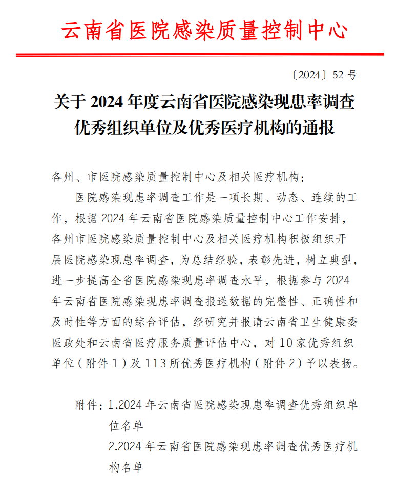 医院感染现患率调查是医院感染管理评价的重要指标,及时掌握医院感染的发生和分布情况,对了解医院感染的变化趋势、降低医院感染风险具有重要的意义。此次被评为2024年云南省医院感染现患率调查优秀医疗机构,不仅是对医院医疗水平和管理水平的认可,更是良好激励。曲靖市第一人民医院将以此为契机,进一步提高医院感染管理水平,保障医疗质量安全。