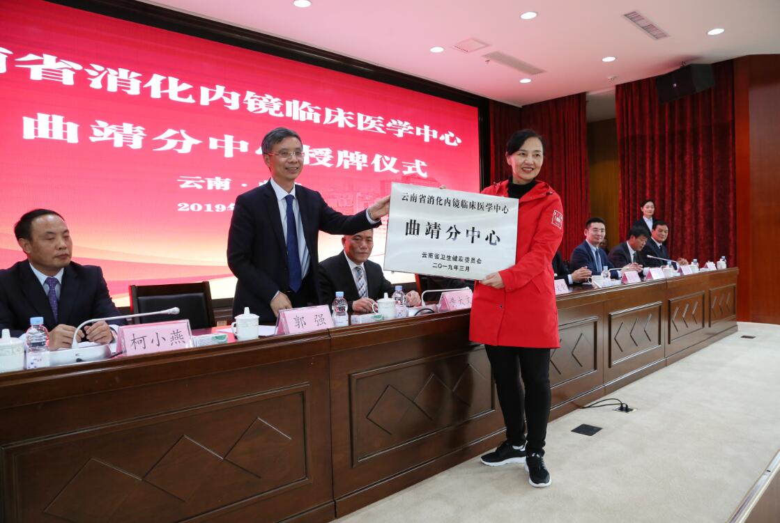 会上,李兆申院士和省委常委、市委书记李文荣授牌,曲靖市第一人民医院党委书记高吉贵和党委副书记、院长唐锐接牌;云南省第一人民医院副院长郭强授牌,曲靖市第一人民医院消化内镜中心主任郑苏云接牌。
