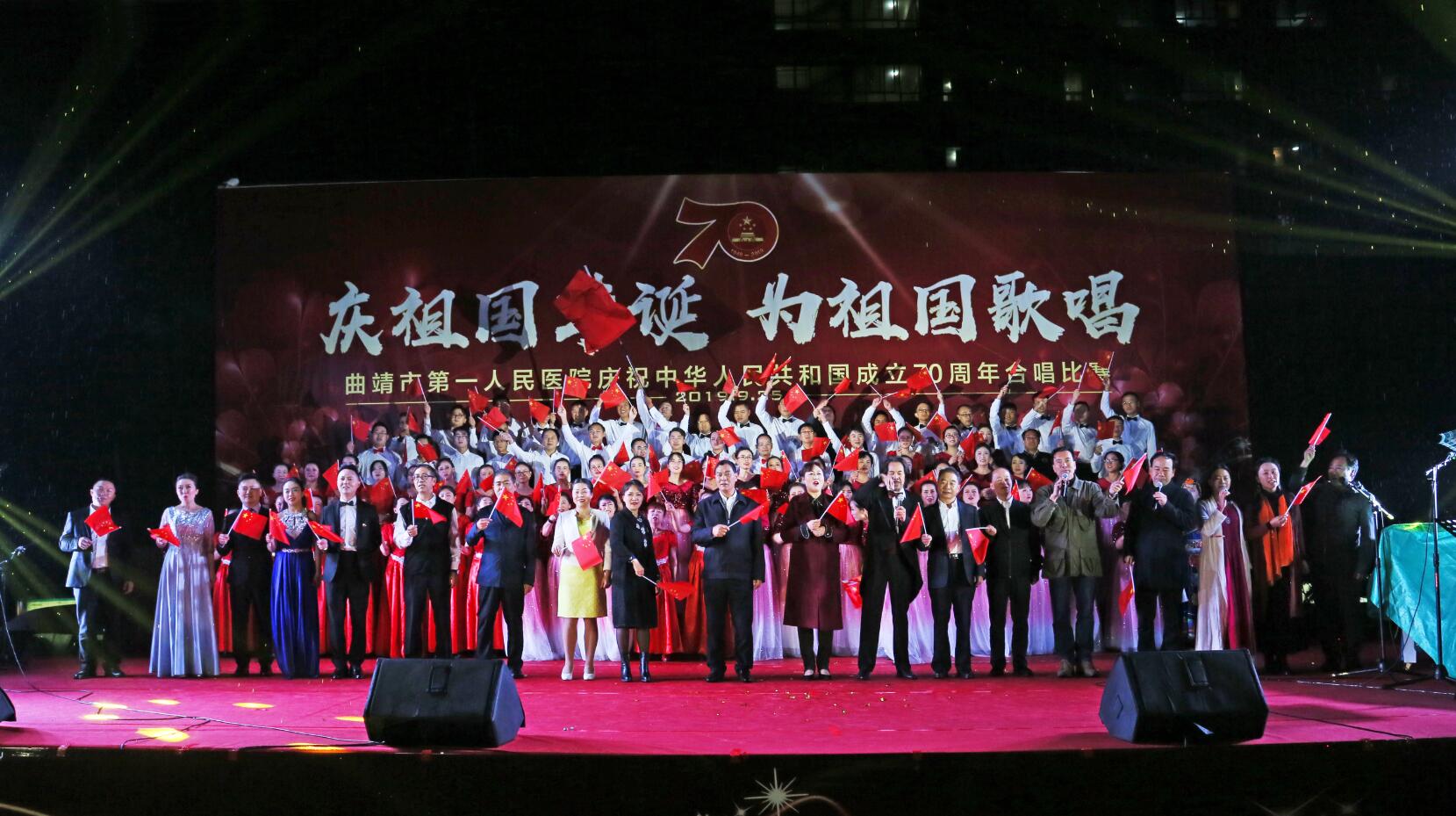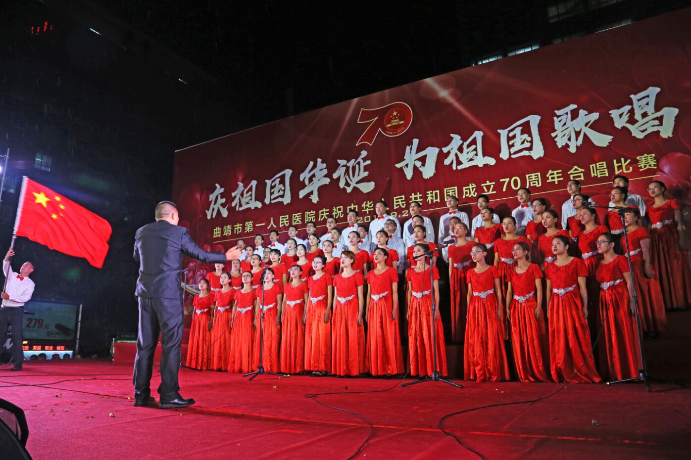 9月25日晚,冒着绵绵细雨,曲靖市第一人民医院庆祝中华人民共和国成立70周年合唱比赛在院内惠滇广场如期举行,来自临床、医技、机关、后勤近2000人组成的47支代表队参加比赛。医务工作者们以深情歌唱的方式歌颂亲爱的祖国、歌颂伟大的中国共产党,庆祝新中国成立70周年。院领导班子出席活动,观看并加入合唱队参与比赛。