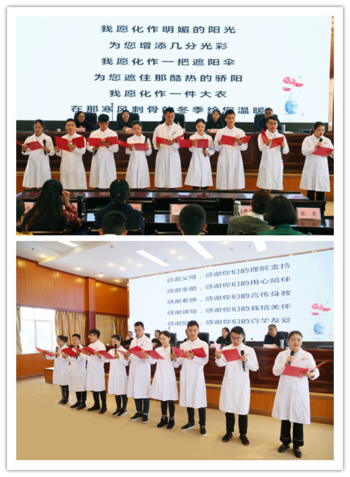 在会上,科教部主任李巧芬同志汇报了医院住院医师规范化培训工作情况,对2019年医院住院医师规范化培训招录情况,培训过程中的入院教育、日常管理、考核管理、师资管理等关键环节的工作开展情况和管理重点,执业医师资格考试首考通过率和结业综合考核首考通过率等核心指标完成情况进行了汇报。与会领导为医院在2019年住院医师规范化培训教学相关比赛和评比活动中获奖的优秀教师和住培医师代表进行了颁奖。住培医师代表向“一对一”责任导师代表行拜师礼,师生代表签订了“师徒协议书”。专业基地主任代表和2019及新入学住培医师代表分别上台进行了交流和表态发言。2019级住培医师代表朗诵了集体创作的诗歌《那背后孜孜不倦的身影》,在诗歌中表达了对恩师、对父母、对学校和医院的深厚情感。最后,由医院分管副院长陈卫文同志作总结发言,她代表医院对新到来的118名2019级住院医师表示热烈的欢迎,对过去5年医院在住院医师规范化培训工作中的成绩和经验给予了充分肯定,进一步强调了未来3年培训期间责任导师、带教老师、住培医师、管理人员各自的工作、学习、管理重点,对下一步的工作提出要求,大家在思想上高度重视,学生在学习中传承尊师重道的优良传统,教师在带教中落实立德树人的重要责任。