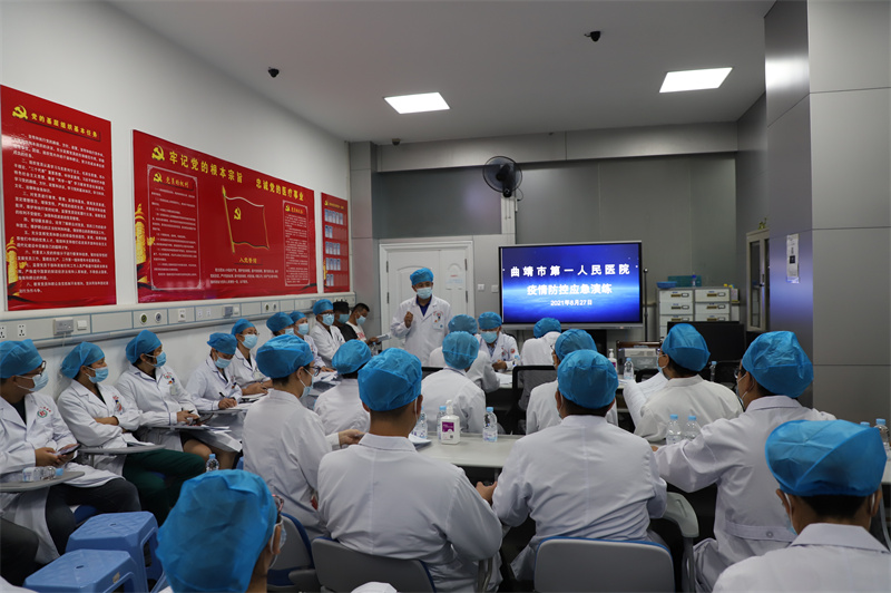 为切实提升医院新冠肺炎疫情防控工作应急处置能力,保障人民群众的生命安全,曲靖市第一人民医院于8月27日19:00-22:00在院本部举行接诊新冠肺炎可疑患者处置流程的实战应急演练,全院10个科室(部门)的相关人员参加活动。院长唐锐现场观摩演练,并在总结会上提出工作要求。