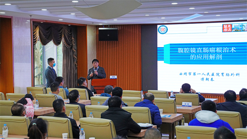 本次会议由曲靖市第一人民医院胃肠外科主办,以“普通外科疾病诊断治疗及精准手术操作,提高基层医疗机构普通外科疾病的诊疗水平”为主题小规模召开。湖南省人民医院陈超武教授团队和曲靖市第一人民医院胃肠外科傅朝春主任团队为与会人员进行了“肠瘘一定要手术吗?”“腹腔镜结直肠癌的应用解剖”“大肠癌淋巴引流及清扫技巧”专题学术讲座和“腹腔镜直肠癌根治术”“腹腔镜胃癌根治术”手术演示。来自市内各家医院近50名学员到会学习。