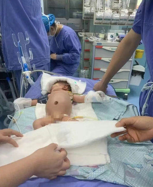 患儿出生后18小时,因呕吐腹胀未解胎便由新生儿转运中心转入市一院儿内科ICU。经会诊,完善相关检查后,考虑新生儿肠闭锁。在北城麻醉科的支持下,市一院儿外科手术团队为患儿行急诊手术,术中诊断新生儿乙状结肠闭锁,闭锁肠段约20cm,术中行闭锁肠段切除,经肛门直肠肌鞘分离拖出后行结肠肛门吻合,手术顺利,术后转儿内ICU治疗。