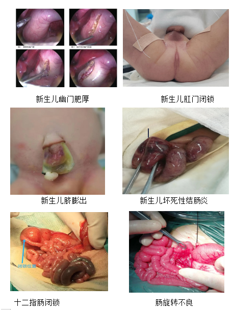 各类新生儿先天性疾病:新生儿旋转不良、新生儿十二指肠闭锁、新生儿肛门闭锁、新生儿幽门肥厚、脐膨出、坏死性结肠炎(