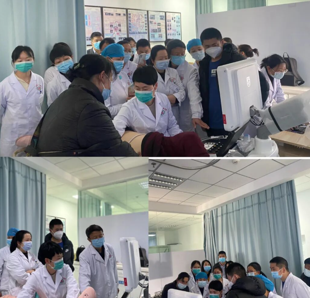 下午,丁云川教授、王庆慧教授、许彭黎老师对十二例患者进行了左心超声造影及腺苷负荷超声造影检查,并结合病例特点详尽地为大家介绍检查要领及注意事项,理论结合实际,现场指导操作,为下一步我院开展腺苷负荷超声造影奠定了扎实的基础。