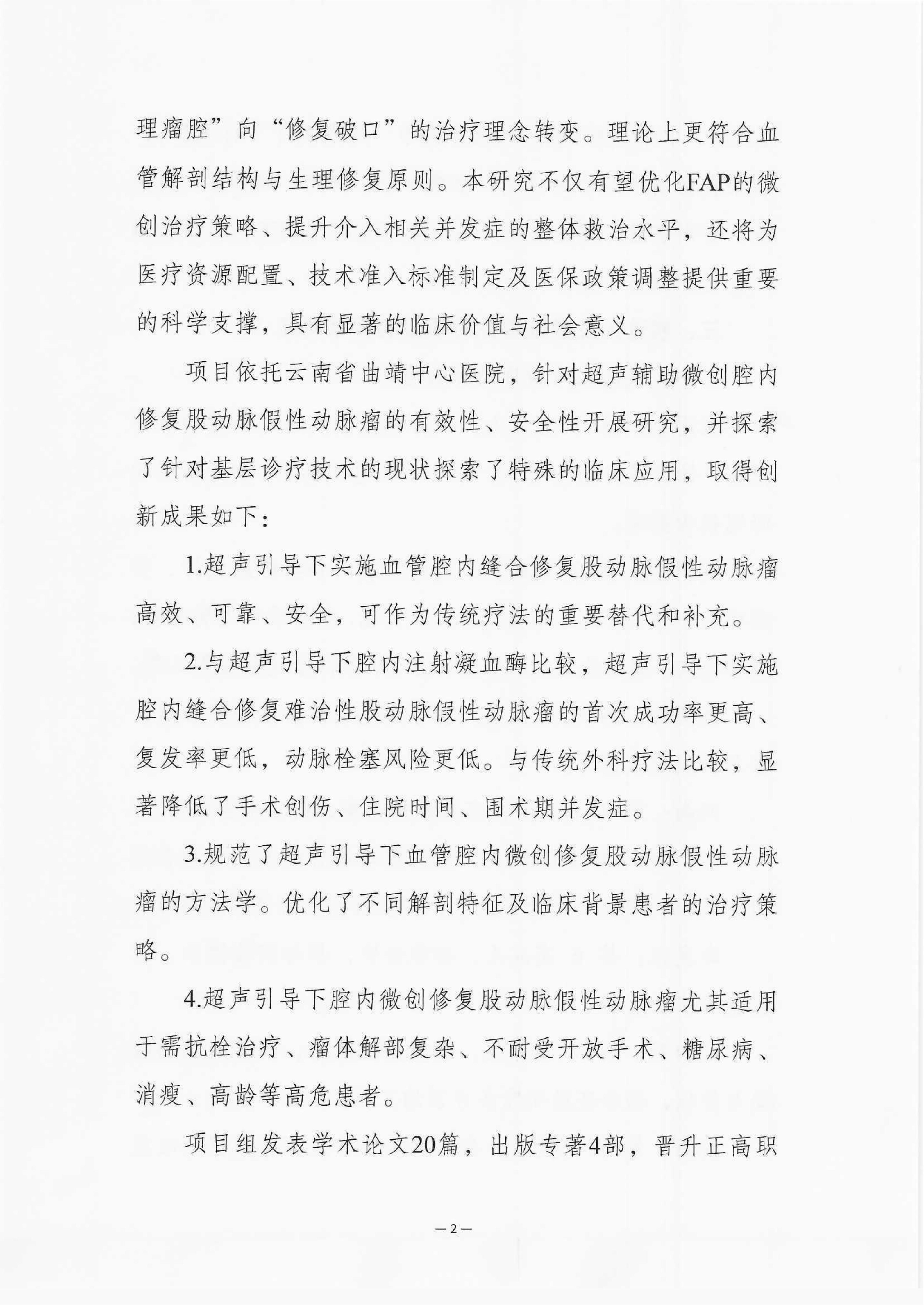 云南省曲靖中心医院关于《超声辅助微创腔内修复股动脉假性动脉瘤的探索与推广》项目申报2025年度云南省卫生科技成果奖的公示