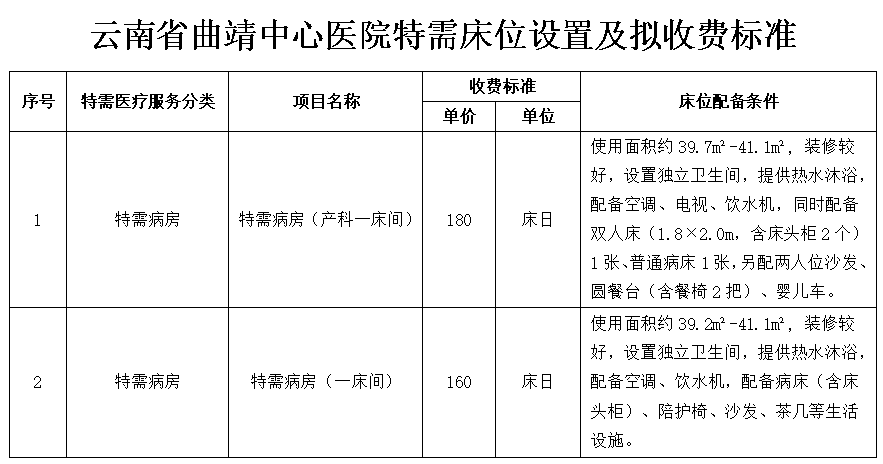 为向患者提供优质的医疗服务,保证广大群众基本医疗需求的同时,满足群众多样化、差异化、个性化医疗需求,医院拟开展特需床位,经医院价格管理委员会专题讨论、医院办公会审议,现将特需病房设置及拟定市场调节价情况公示如下,公示时间2026年1 月8日至1月14日,公示期间如有意见建议请致电医院医保管理部价格管理科,联系电话:0874-6661051。
