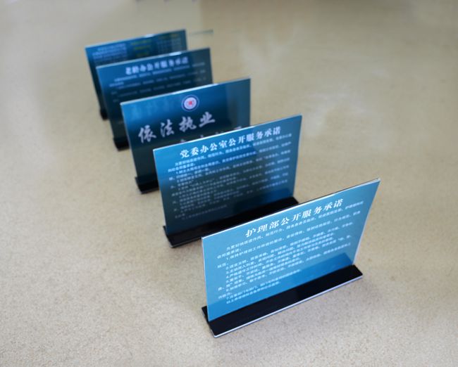 7月13日,医院统一制作服务承诺牌,下图是为服务窗口及各临床医技科室,结合专业特点和工作实际,分别制作的服务承诺牌(一面为公开服务承诺内容,另一面为廉政文化展板)。