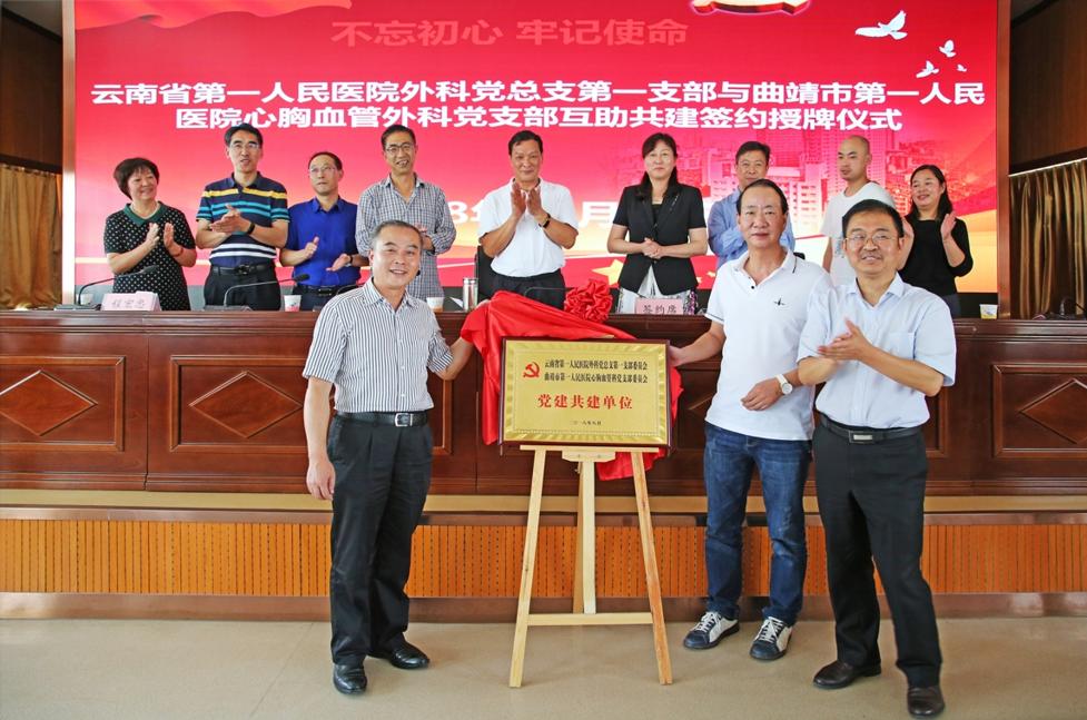 8月10日下午,云南省第一人民医院与曲靖市第一人民医院胸外科专科联盟及党支部结对共建签约、授牌及揭牌仪式在曲靖市第一人民医院举行。中共云南省第一人民医院外科总支副书记毛新、外科一支部书记程宏忠、胸外科主任彭浩、副主任彭俊、心脏大血管外科主任李洪荣,市一院党委书记高吉贵、党委副书记、院长唐锐、副院长丁绍平以及相关科室部门负责人及医务人员100余人参加了此次签约揭牌仪式。