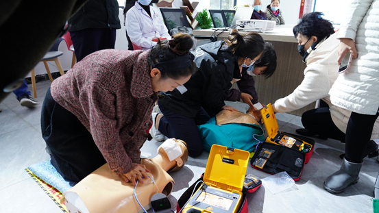 本次授课主要内容为成人心肺复苏、AED的使用、成人气道异物梗阻的急救知识等,既有重点知识讲解,又有手把手的操作演示。俗话说:“眼看千遍,不如手过一遍”。现场居民纷纷踊跃参与,体验急救知识的操作方法。