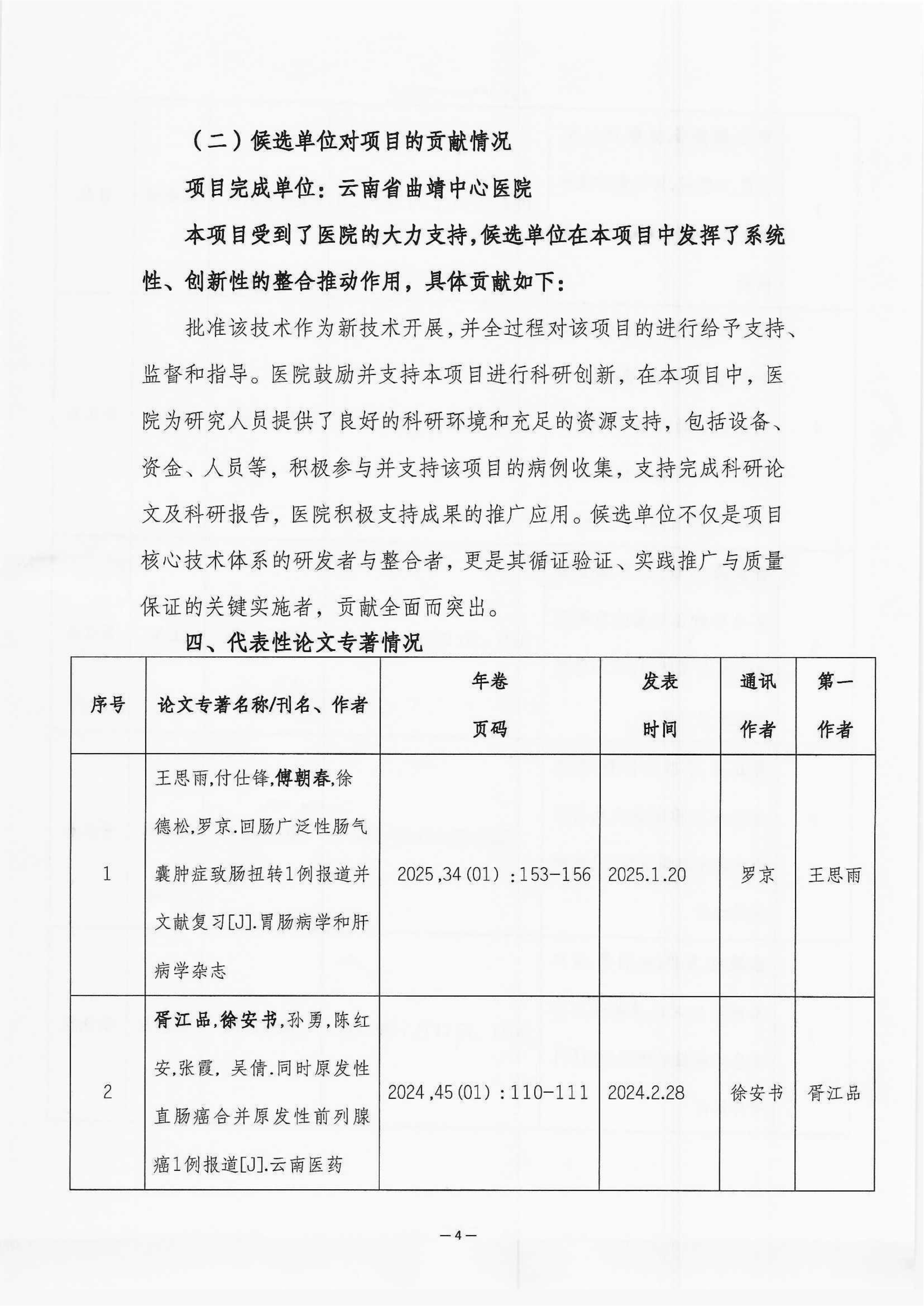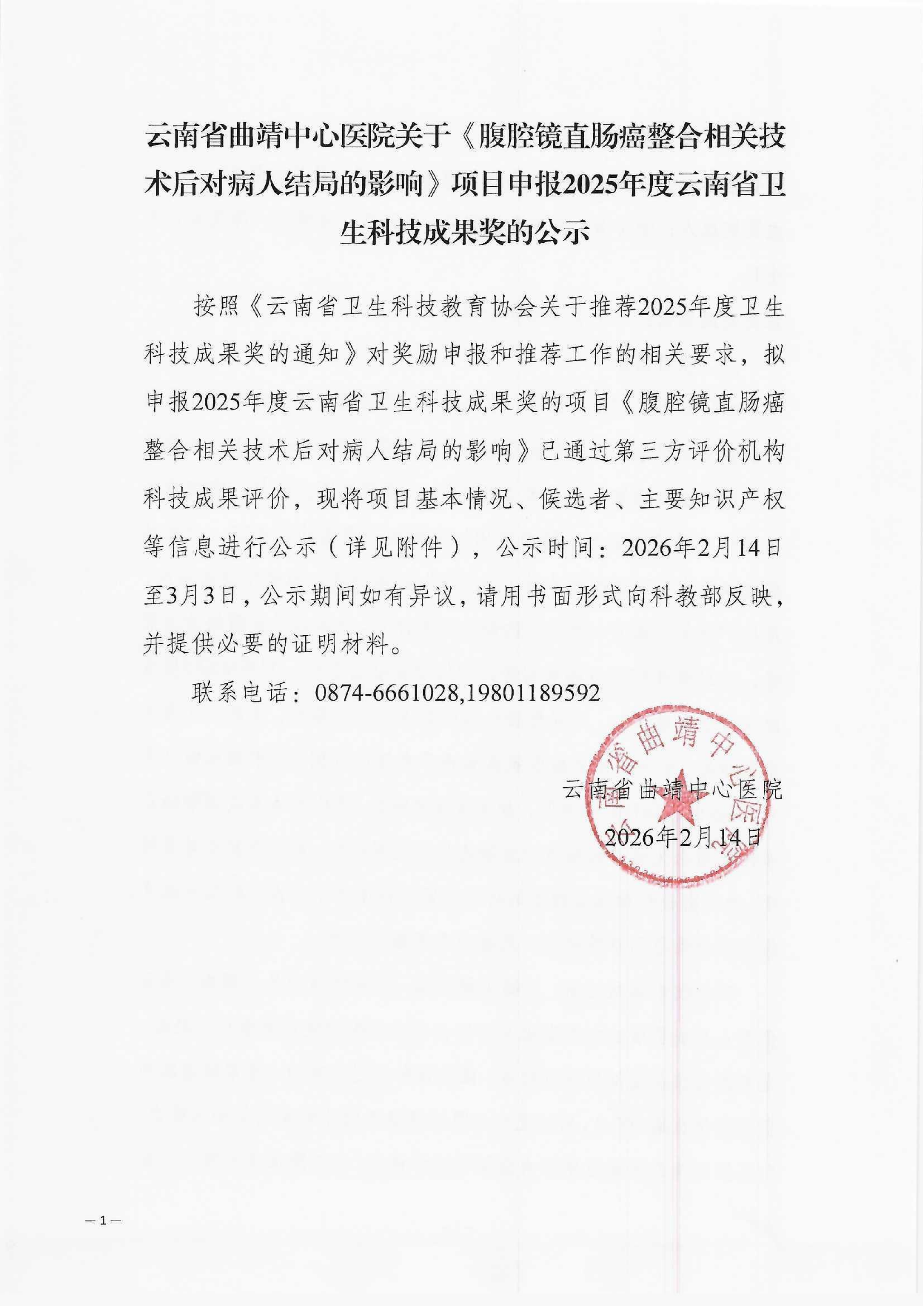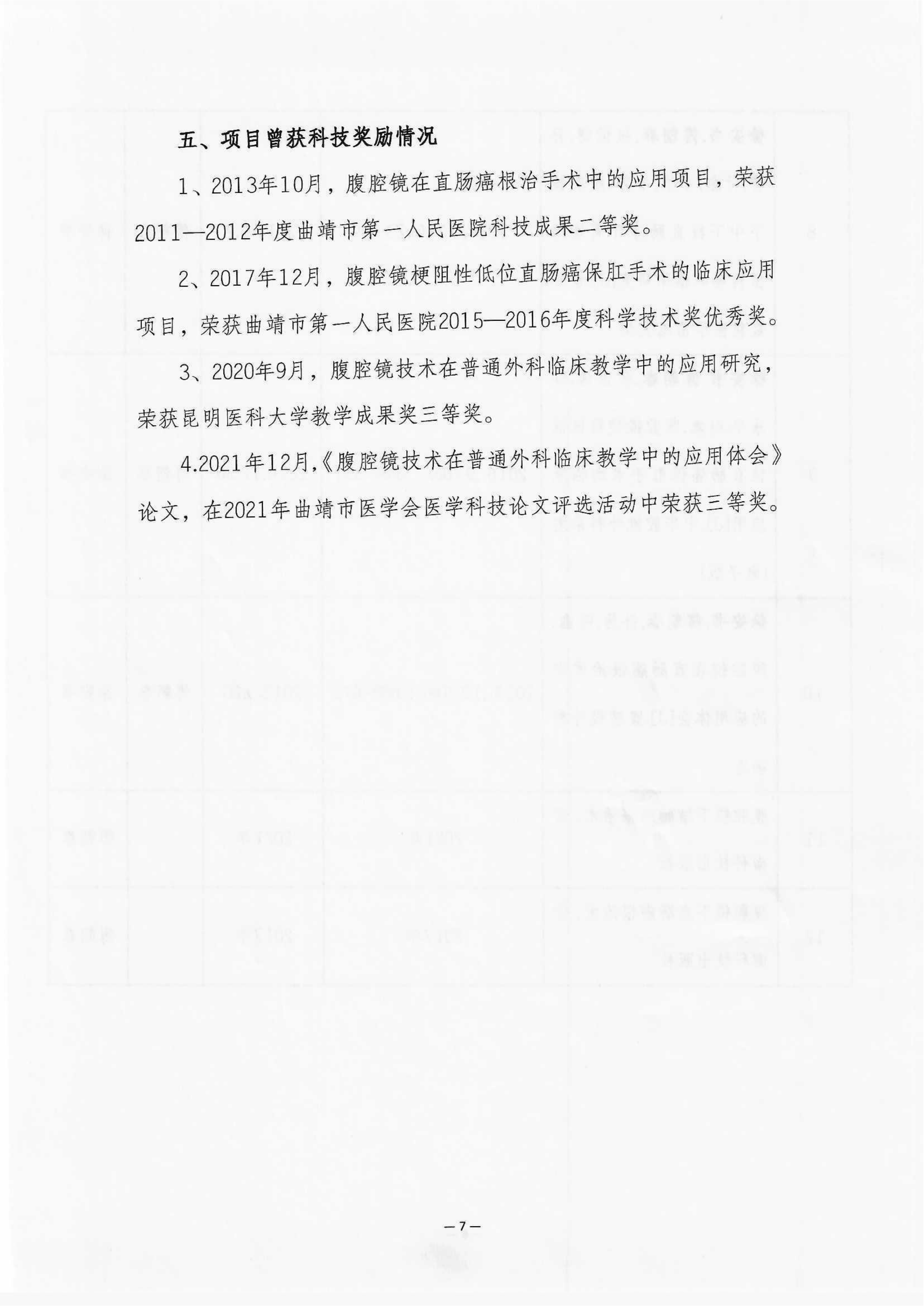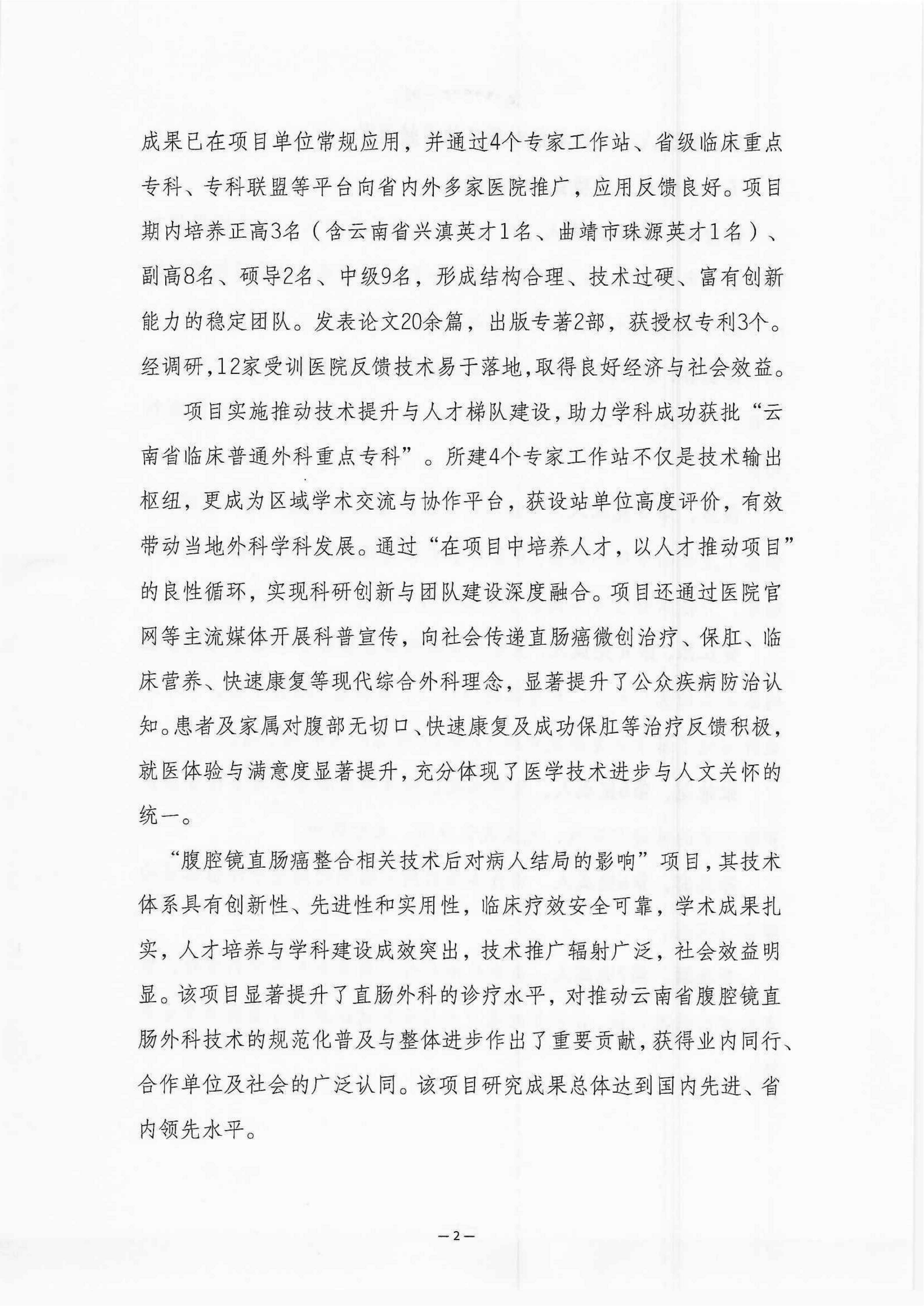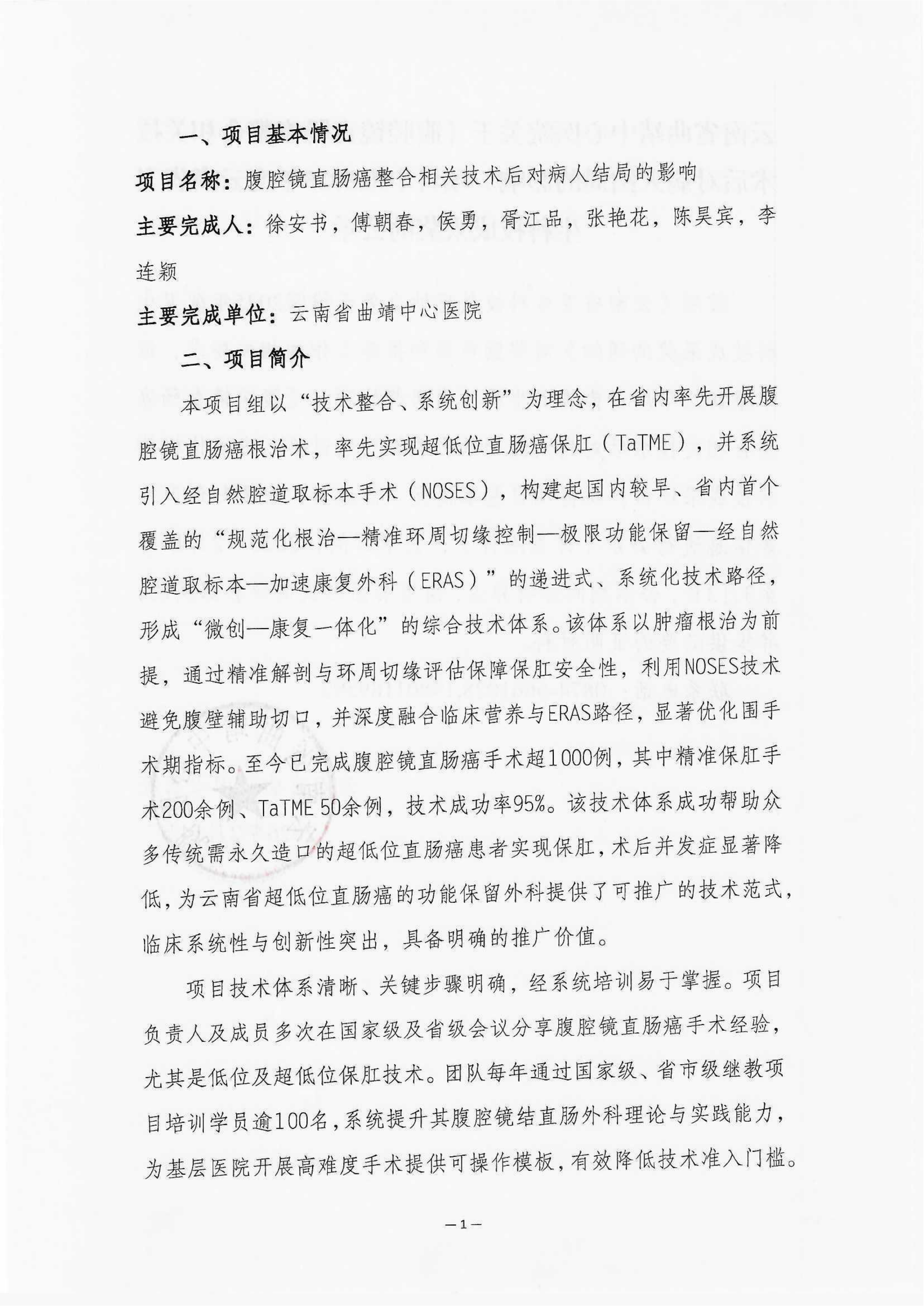 云南省曲靖中心医院关于《腹腔镜直肠癌整合相关技术后对病人结局的影响》项目申报2025年度云南省卫生科技成果奖的公示