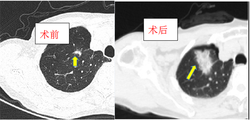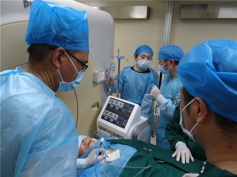 患者王某69岁,右肺癌术后六年。1月前,在市一院CT检查时发现肺内部分结节增大,变实。由于常规化疗、靶向、免疫治疗等存在多方困难,经多学科MDT讨论后决定,邀请昆明市延安医院张培先教授到我院进行手术指导,由肿瘤科张超主任及其团队对变化较大的两个结节给予“消融治疗”。仅8分钟,两个肺结节完全被灭活。术后,患者病情平稳,稍作休息后便可下床行走。